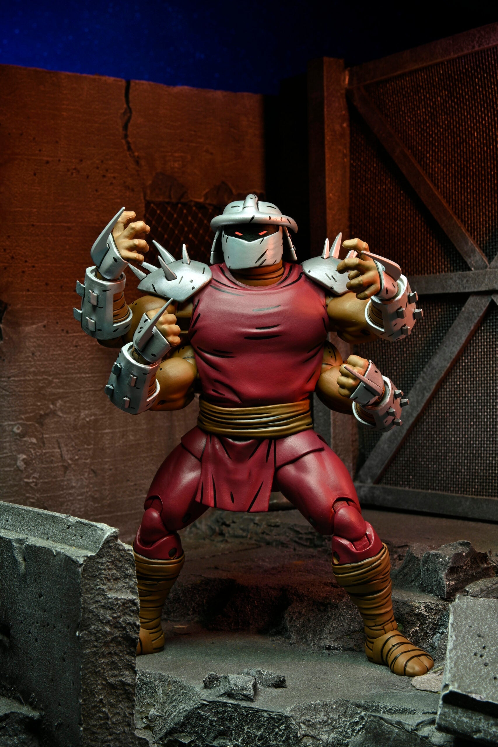 Basé sur les bandes dessinées originales Eastman & Laird Teenage Mutant Ninja Turtles de Mirage Studios ! Shredder est de retour… en quelque sorte ? Les Foot ont mené des expériences de clonage pour faire sortir leur chef de la tombe. Alors qu'elles résolvent les bugs, ou plus précisément les Space Worms, pour perfectionner le processus de clonage, les tortues doivent combattre ces monstruosités tordues. Ces figurines à l'échelle de 7″ (le Shredder à 4 bras mesure environ 7″ de haut et le Mini Shredder mesure 2,8″ de haut) comprennent des mains supplémentaires et des attaches de vers spatiaux pour créer un avant-bras endommagé par le combat ! Livré dans un emballage spécial boîte-fenêtre sur le thème de la bande dessinée avec une nouvelle illustration de Kevin Eastman !